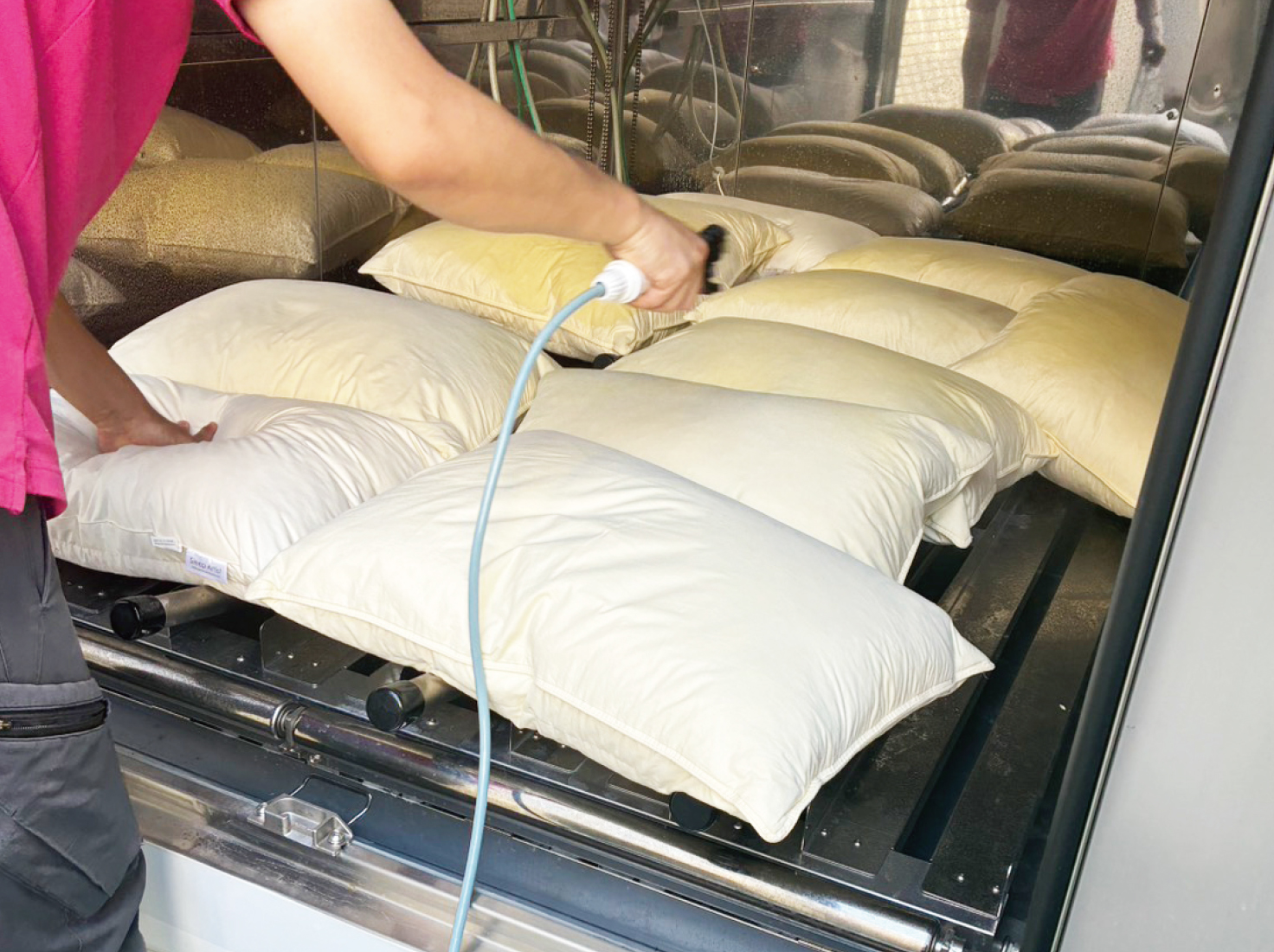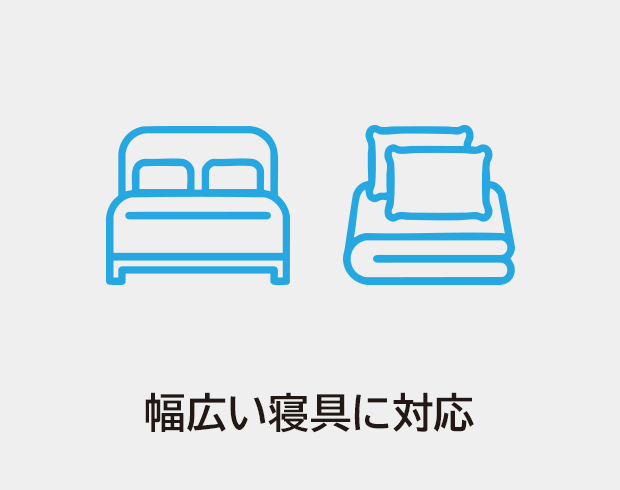 羽毛布団、羊毛布団、和布団、化繊布団、マットレス、ベッドマットのトップカバーなど、様々な素材・形状の寝具を傷めずに処理できます。