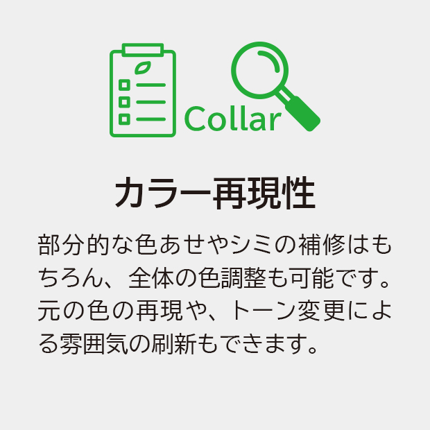 経年劣化や日焼けによる色あせ、色落ち、頑固な汚れやシミなどで美観が損なわれたカーペットや絨毯に対し、部分的または全面的に染色を施すことで、まるで新品同様の仕上がりを実現します。